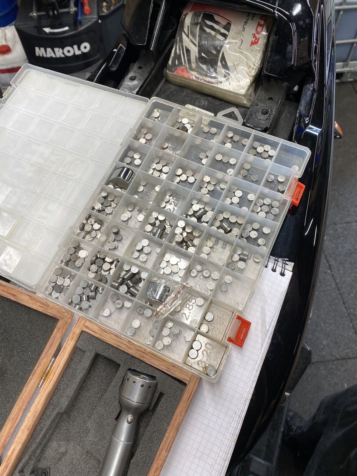 En plus d'une révision complète (vidange de l'huile moteur, filtre à huile, filtre à air, changement du liquide de frein, contrôle et changement des plaquettes de frein ainsi que les disques), nous avons effectué un contrôle ainsi que le réglage des jeux aux soupapes.
